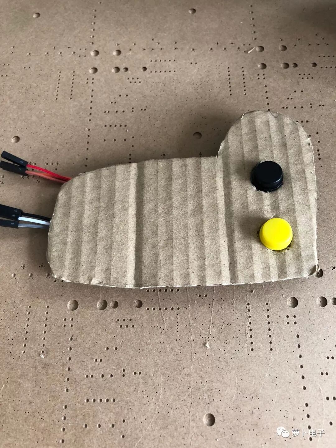 根据自己的喜好将废旧纸盒裁剪, 制作成简易相机模样,预留两个按键模块孔洞,一个5110显示屏孔洞,一个一次性纸杯孔洞(PTC06 串口摄像头模块放于一次性纸杯内作为相机摄像头),裁剪拼装过程中用热干胶要实现。这样简单的照相机模型就出来了。
